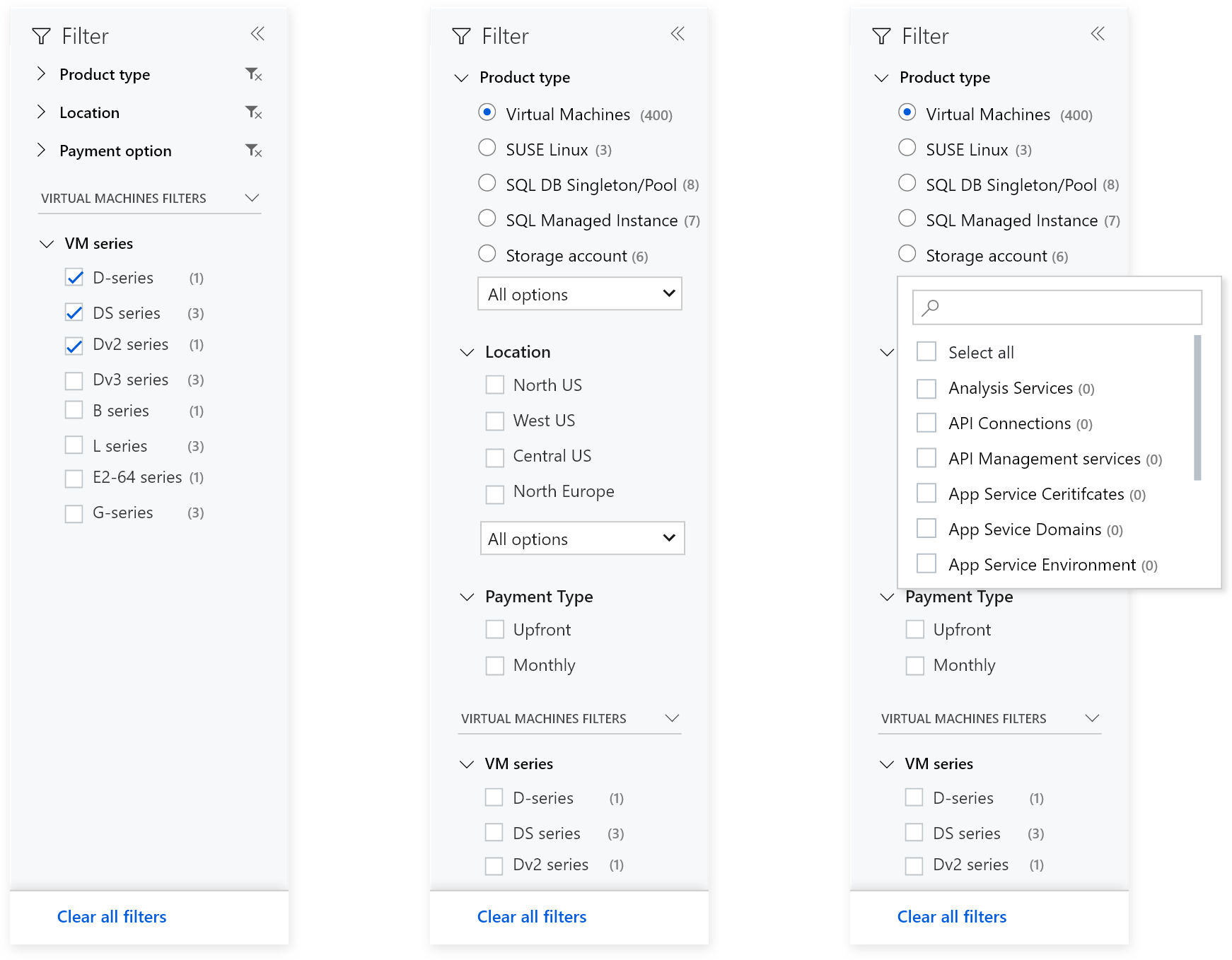 Depends on different enterprise company's needs and type of roles users have. They come to purchase products with different goals. In order to support different way of filtering, we talked to users and understand their prioritization when buying Azure products, such as type, regions, hardware requirements etc. And consolidated the key factors into the facet search module.
