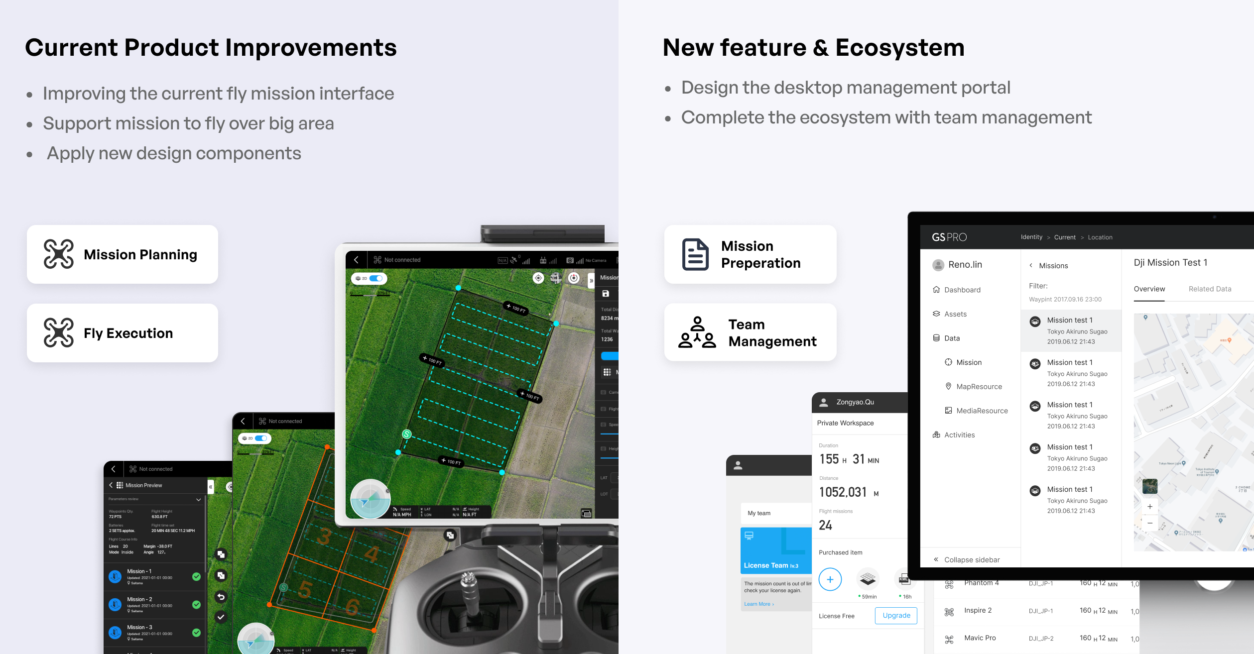 During my time as a solo product designer at DJI’s Tokyo office, I had the opportunity to redesign and introduce new features for GS Pro, DJI’s enterprise flight control application.