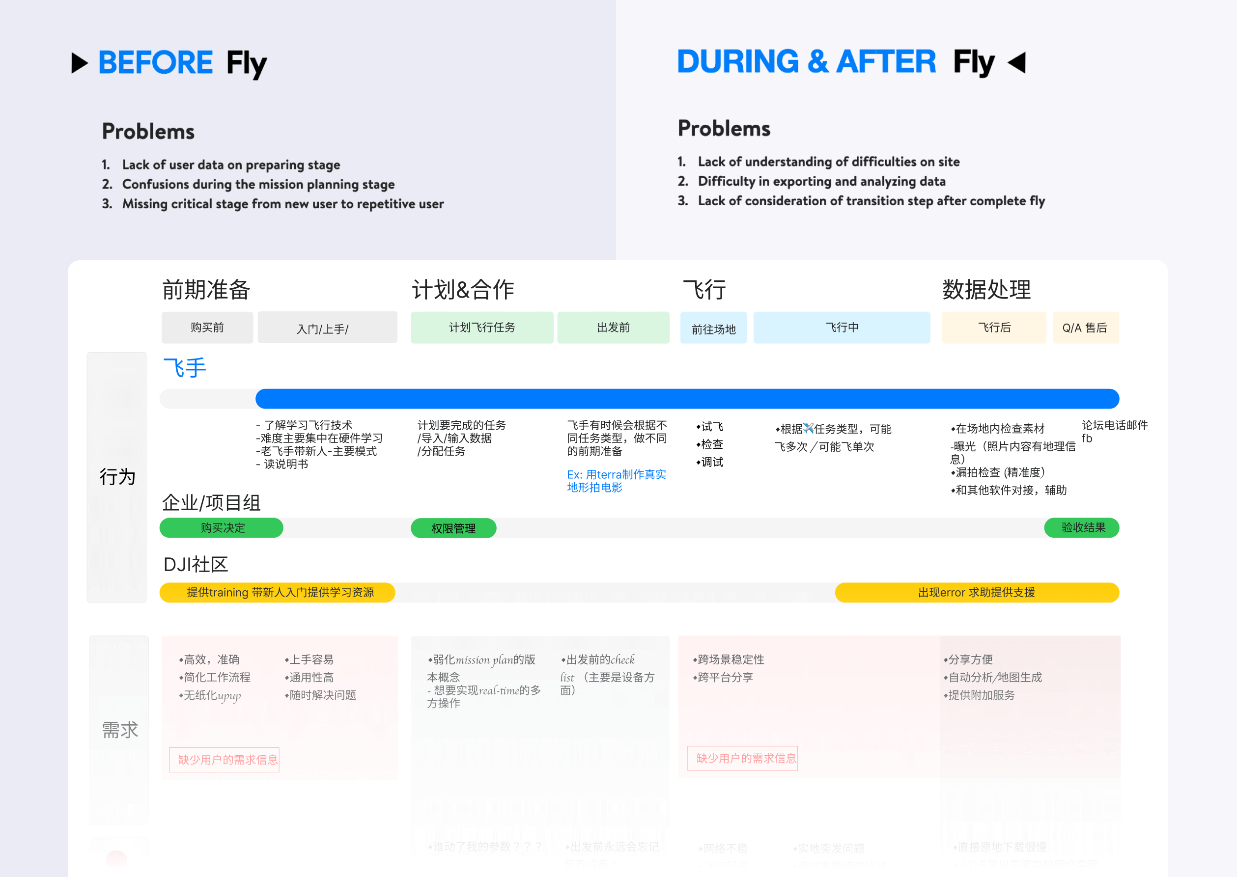 One key insight we uncovered was that user pain points and needs differ significantly before, during, and after a flight mission.Before a mission, users struggle primarily with the lack of information needed for thorough planning. In contrast, during and after a mission, the greatest challenges shift toward effective documentation and real-time analysis. This grouping has helped the team to prioritized the feature during the roadmap discussion.