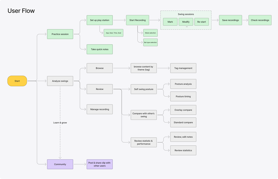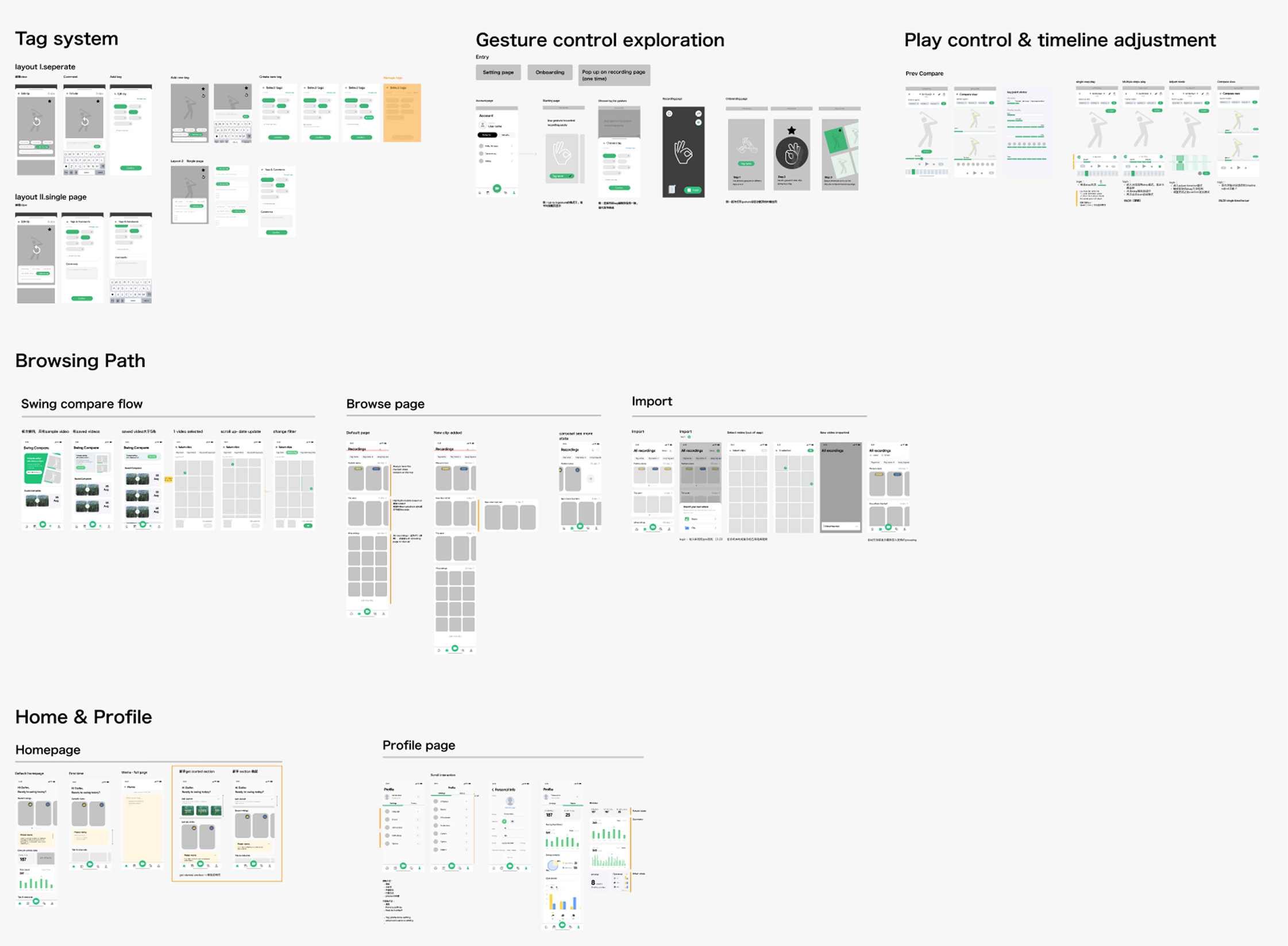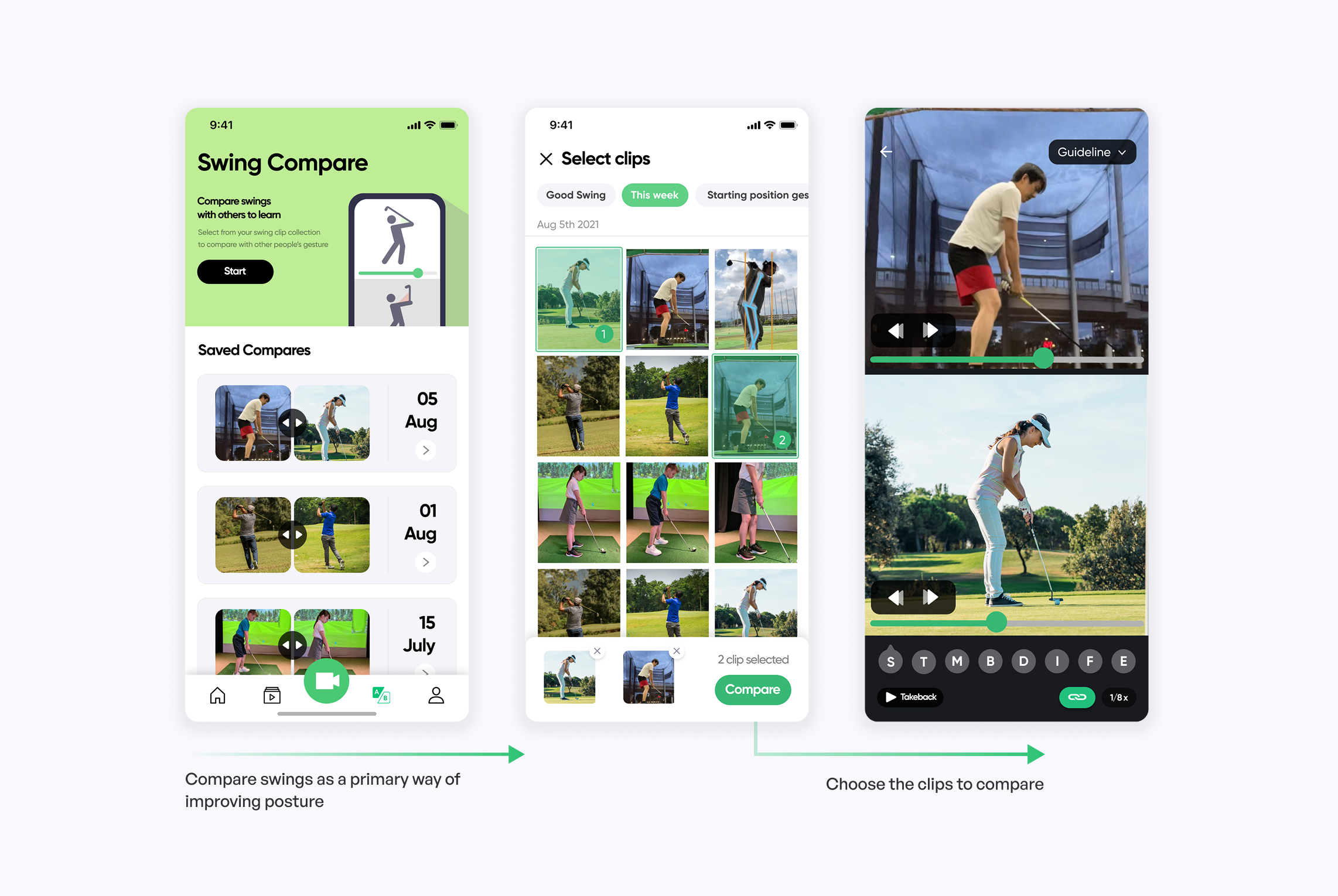Based on the insight that comparison with professional players is one of the most effective ways to improve swing technique, we designed a swing comparison library that enables side-by-side viewing of a user’s swing alongside professional examples. By consolidating personal recordings, curated pro swings, and community posts into a single, unified view, the feature helps users quickly identify differences in posture, timing, and motion—making self-practice more structured and actionable.
