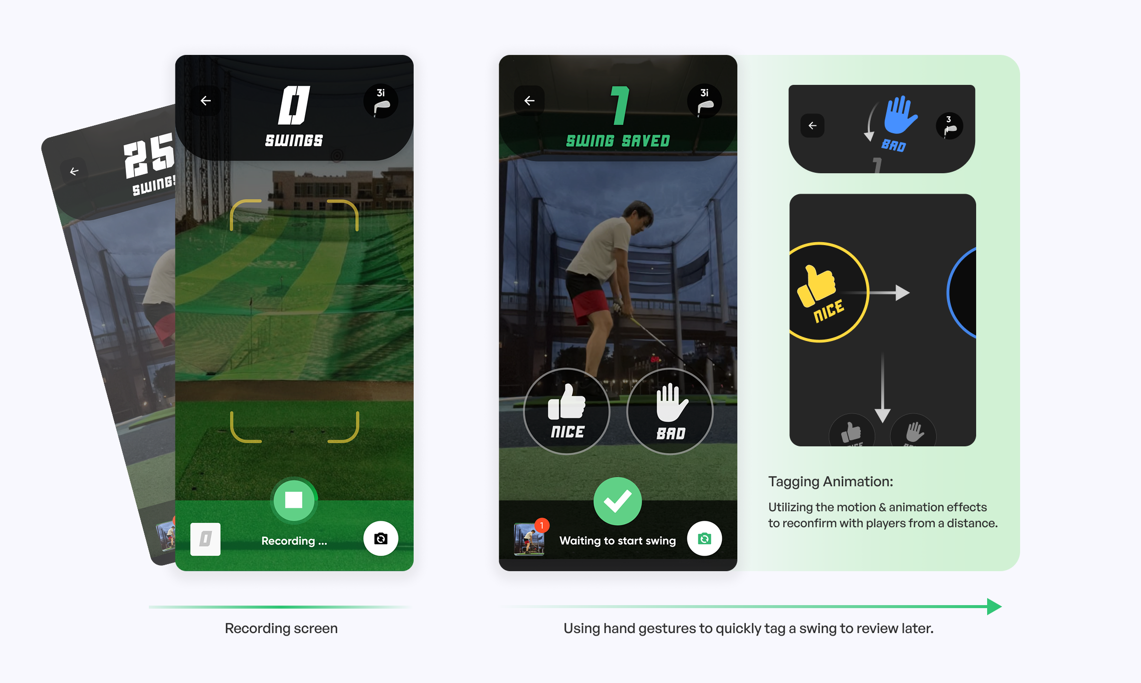 To free players from interacting with the screen and allow them to fully focus on their swing, we designed a gesture-based remote control system for motion capture. With the phone placed at a set distance, players can use simple hand gestures to control, mark, and modify swing recordings hands-free.