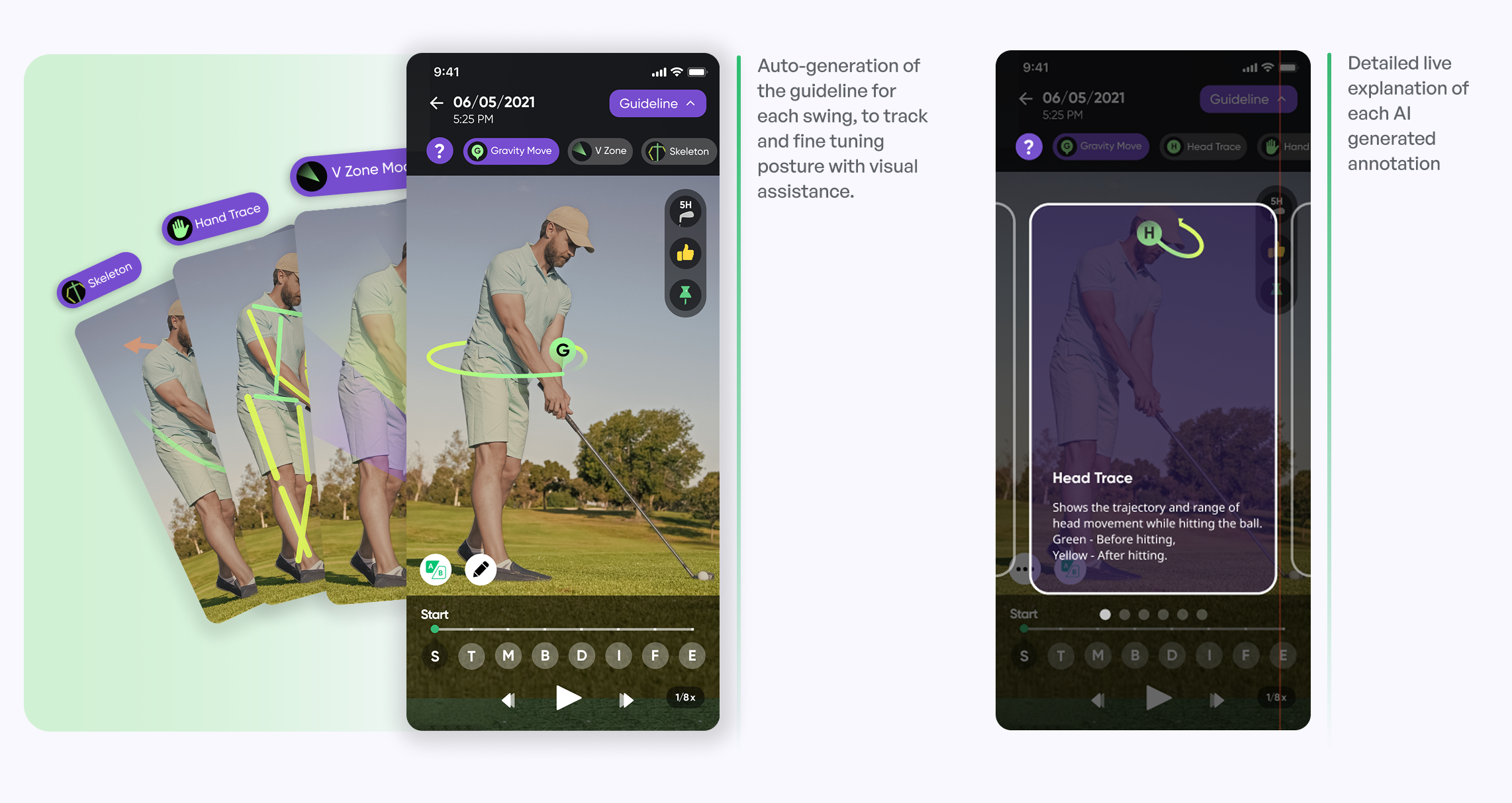 The app delivers precise swing analysis through real-time visual overlays on the recorded swing video. By collaborating with experienced golf players, we synthesized the most important swing checkpoints and transformed them into animated guideline overlays, allowing users to intuitively compare their posture and motion against expert-recommended form—without relying on technical terminology.